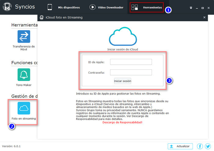 Nota: No necesitas conectar tu dispositivo al PC. Simplemente vaya a pestaña de herramientas en la parte superior, hace clic en Fotos en streaming en la sección de administración de dispositivos, introduzca tu ID de Apple y la contraseña en la ventana para iniciar sesión en tu cuenta de iCloud vía Syncios foto Transfer.